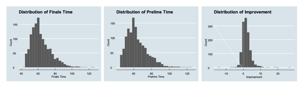 Most of the data is around 60 seconds with a few observations reaching 80 or even over 100 seconds but no extreme outliers. Additionally, the finals time seems to be slightly more concentrated at lower values. The time improvement from seed to prelims is centered above 0, indicating that most finalists improved upon their in-season seed time in prelims. This distribution is fairly symmetric with some outliers gaining more than 10 seconds or improving by over 20 seconds.